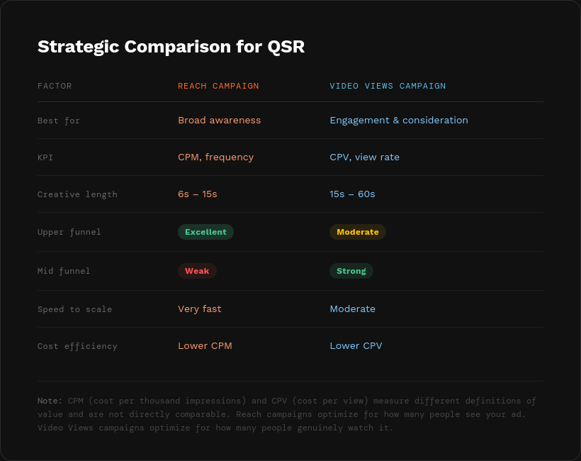 YouTube for Reach: If your goal is mental availability, like launching a new item, promoting a price point, or reinforcing brand recall, a 6-15 second Reach campaign with frequency control can outperform longer formats. The shorter format forces creative discipline, and the CPM model helps you maximize unique reach efficiently.
