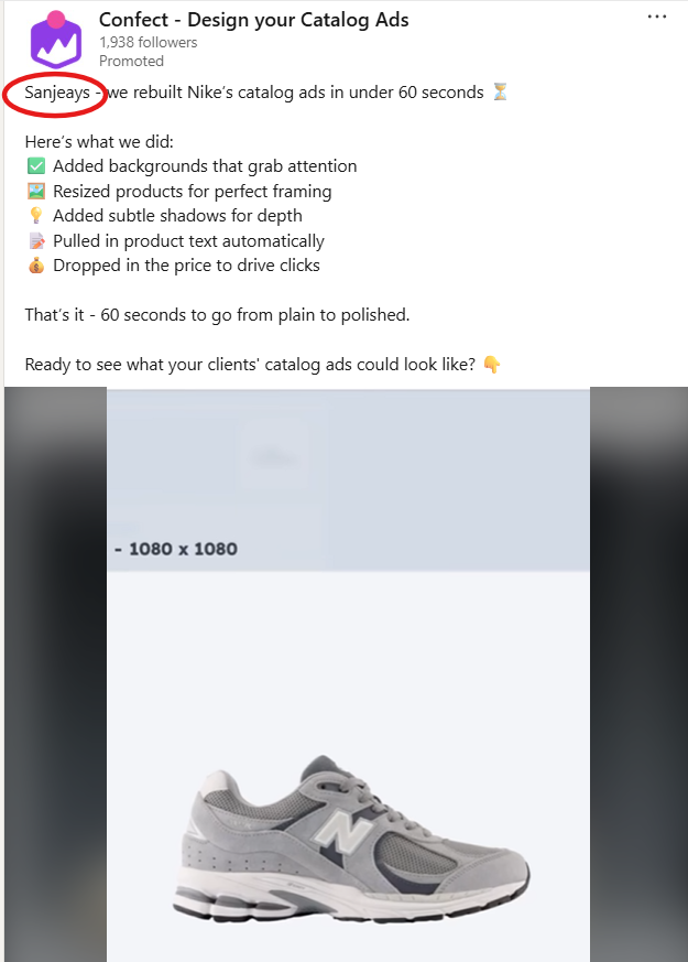 But most markters including seasoned ones in B2B Demand Generartion often forget that you can personalize ad copy in sponsored content (ads on feeds) in addition to the InMail and Dynamic ads using LinkedIn Macros. Below is an example;